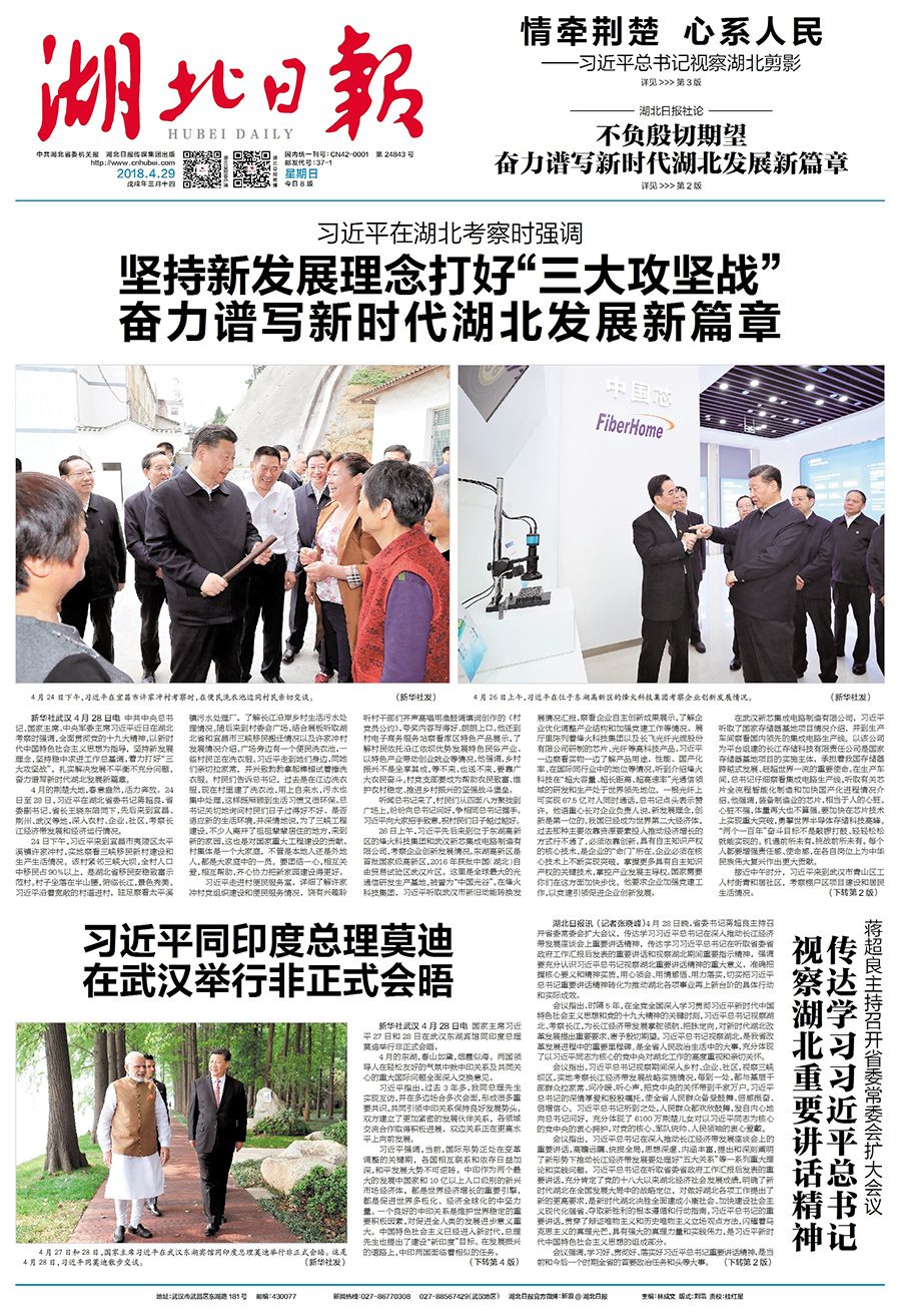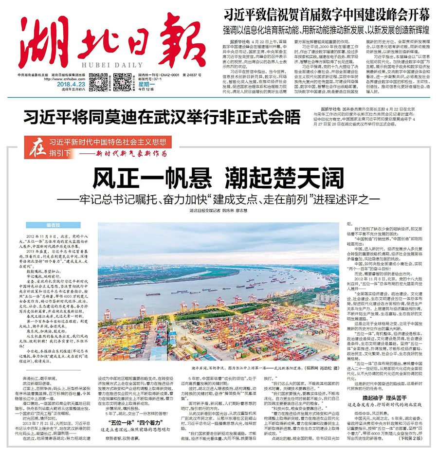 2018年4月,習(xí)近平總書(shū)記視察湖北、考察長(zhǎng)江,殷殷囑托重如千鈞、激勵(lì)荊楚。在推出《風(fēng)正一帆懸 潮起楚天闊》《黨旗領(lǐng)航,永葆奮斗初心》等8篇“牢記總書(shū)記囑托、奮力加快‘建成支點(diǎn)、走在前列’進(jìn)程”大型系列述評(píng),深入、生動(dòng)展示習(xí)近平總書(shū)記2013年視察湖北以來(lái)的巨大變化和發(fā)展成就的基礎(chǔ)上,湖北日?qǐng)?bào)連續(xù)推出“習(xí)近平總書(shū)記視察湖北重要講話引發(fā)強(qiáng)烈反響”系列報(bào)道,以及《四月芳菲正當(dāng)時(shí) 巨筆如椽點(diǎn)江山》《一江春水熱荊楚 殷殷關(guān)懷暖民心》兩個(gè)整版的“習(xí)近平總書(shū)記視察湖北回訪記”,生動(dòng)展現(xiàn)習(xí)近平總書(shū)記視察湖北、考察長(zhǎng)江的足跡與情懷,生動(dòng)宣傳習(xí)近平總書(shū)記對(duì)湖北的深情厚愛(ài)和殷殷囑托,生動(dòng)闡釋重要講話精神的思想偉力和科學(xué)內(nèi)涵。隨后,持續(xù)推出“牢記殷殷囑托 奮力譜寫(xiě)新時(shí)代湖北高質(zhì)量發(fā)展新篇章”專(zhuān)版175個(gè),全面、及時(shí)展現(xiàn)湖北的探索實(shí)踐成效。