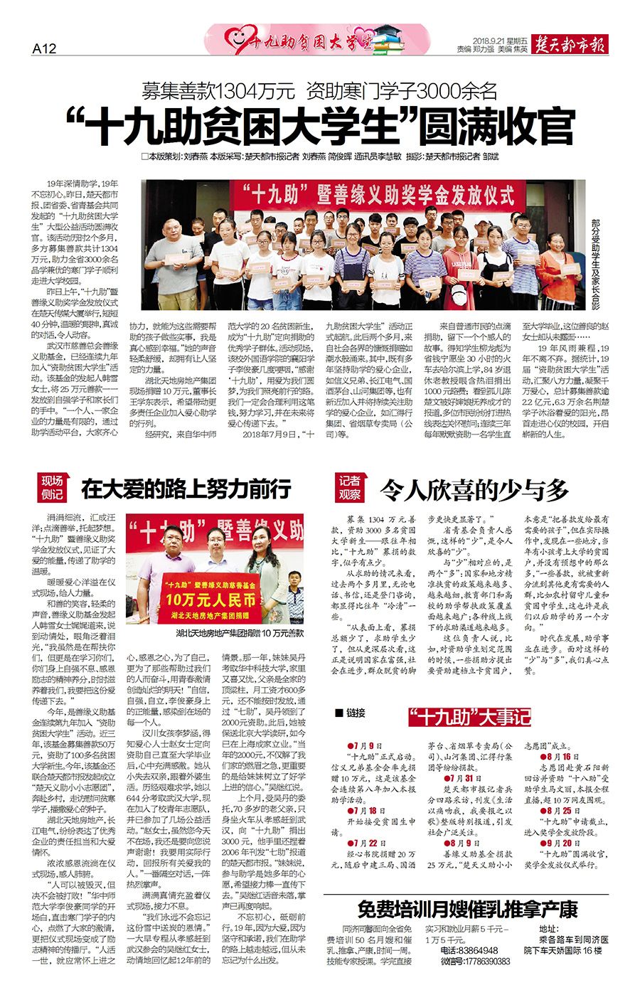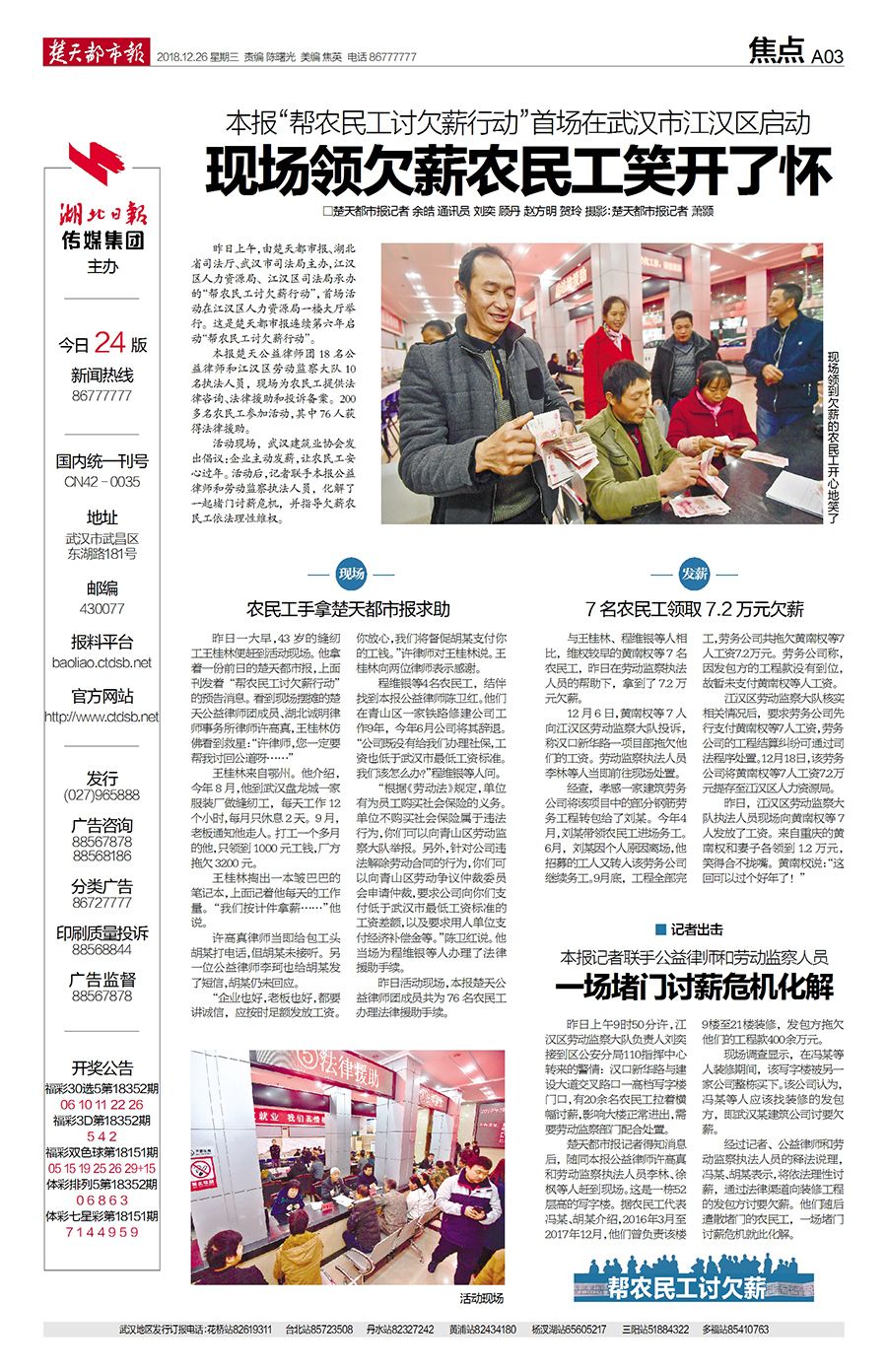 關(guān)注弱勢(shì)群體,維護(hù)群眾權(quán)益。黨報(bào)熱線365《2018暖薪行動(dòng)》以及《春風(fēng)行動(dòng)暖荊楚》《寒冬里的暖心故事》等系列報(bào)道,關(guān)注農(nóng)民工欠薪、就業(yè)以及“三留守”人員生活狀況,傳遞黨和政府溫暖。楚天都市報(bào)聯(lián)合團(tuán)省委、省青基會(huì)等連續(xù)舉辦19屆“資助貧困大學(xué)生”活動(dòng),累計(jì)募集善款2.2億元、資助6.3萬(wàn)人;連續(xù)6年開(kāi)展“幫農(nóng)民工討欠薪行動(dòng)”活動(dòng),累計(jì)幫助追討欠薪1.13億元;常年開(kāi)設(shè)“幫到底”專(zhuān)欄,組織10余場(chǎng)“市民有約3·15維權(quán)熱線”活動(dòng),推動(dòng)行業(yè)自律,幫助群眾解決困難。