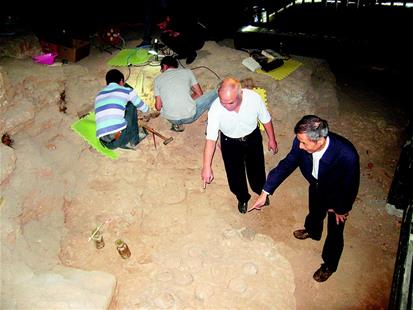 圖為:李正琪(右一)在鄖縣恐龍蛋化石修復現場。(圖片由本人提供)