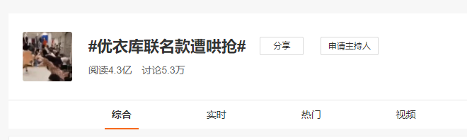此外,截至9時(shí),新浪微博#全員kaws#話(huà)題閱讀量4.3億次,討論7.9萬(wàn)次;新浪微博#優(yōu)衣庫(kù)聯(lián)名款遭哄搶#話(huà)題閱讀量4.3億次,討論5.3萬(wàn)次。