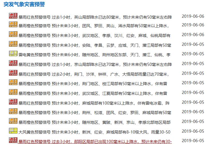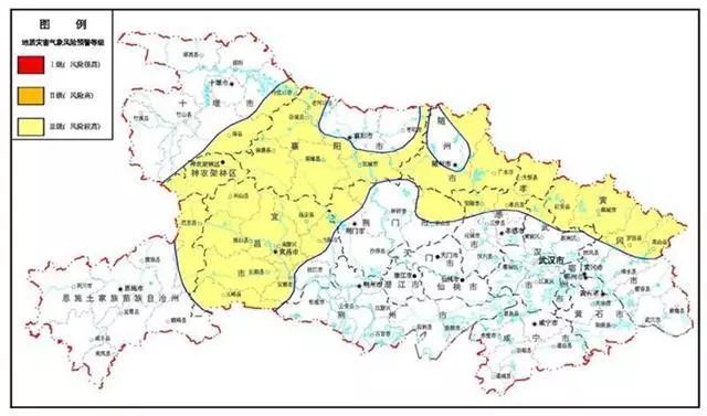 6月5日20時至6月6日20時,預計三峽庫區,神農架林區、宜昌地區、襄陽地區、隨州地區,十堰(丹江口東部、房縣東部)、荊門(荊門市北部城區、鐘祥西北部、京山北部)、孝感(安陸、孝昌北部、大悟)、武漢(黃陂北部、新洲東北部)、黃岡(紅安、麻城、羅田、英山)以及其他暴雨中心發生崩塌、滑坡、泥石流的風險較高(三級),請各級自然資源(國土資源)部門注意地質災害防范,做好地質災害隱患巡排查工作。