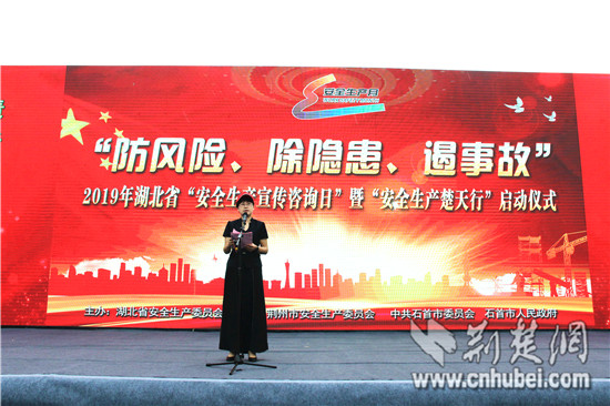 荊楚網客戶端-荊楚網消息(記者張城、實習生任碧瓊 通訊員李偉、周怡)6月是全國第18個安全生產月,今年活動主題為“防風險、除隱患、遏事故”。6月12日,2019年湖北省“安全生產宣傳咨詢日”暨“安全生產楚天行”在石首市正式啟動。省安委會辦公室副主任、省應急管理廳副廳長閘源虹出席并講話。
