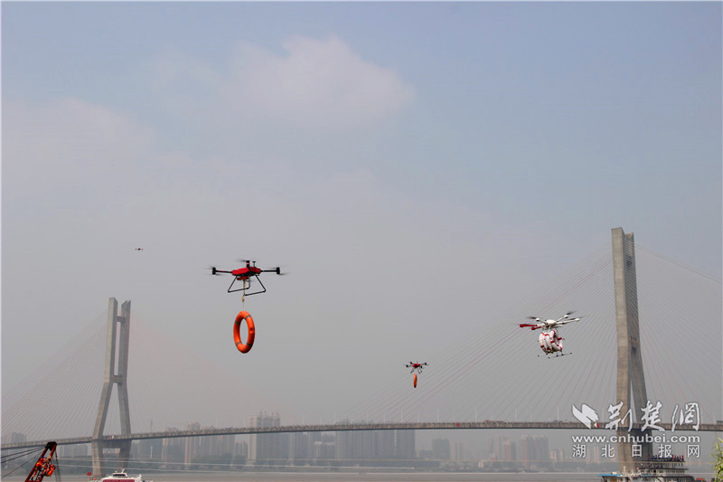 無人機分隊拋投救生圈。(記者 萬詩思、胡小軍攝)