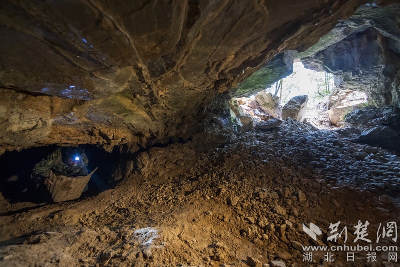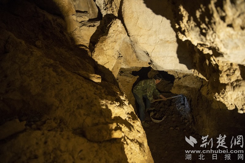 陳顯兵正在溶洞里作業,用撮箕將洞里的碎石搬運出溶洞。記者 劉建維 攝