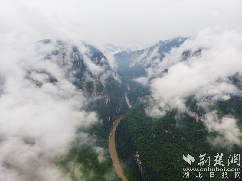 鳥瞰云霧中的尚家村花天河峽谷。記者 劉建維 攝(無人機拍攝)