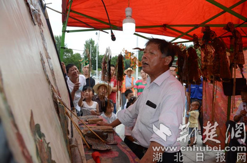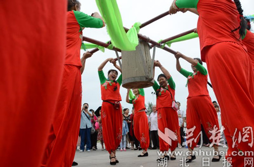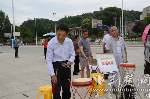 大悟高腔皮影傳承人李述明在嗩吶伴奏下,一邊亮開喉嚨,高聲吟唱,一邊靈巧、快速的舞動手中的皮影,勾起老人們的回憶,吸引孩童前來觀看;在北路子花鼓戲鼓架前,傳承人張友猛手中敲著鋼片,口里唱著經典流傳的花鼓戲;大悟織錦帶第五代織錦人陳登梅在母親的注視下,一邊不停地梭動手中的織機,一邊向市民介紹大悟織錦帶技藝......宣化店打秧歌、李樓舞獅隊等非遺文化項目展演前也都擠滿了群眾。