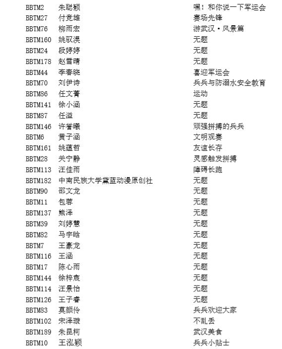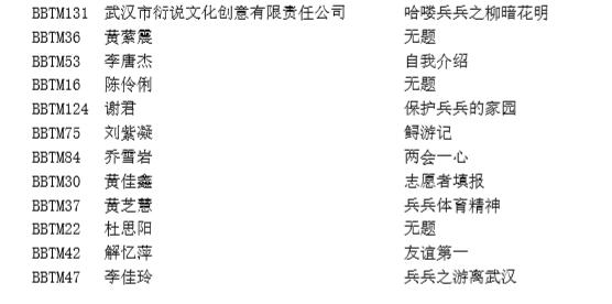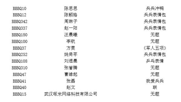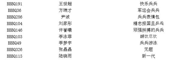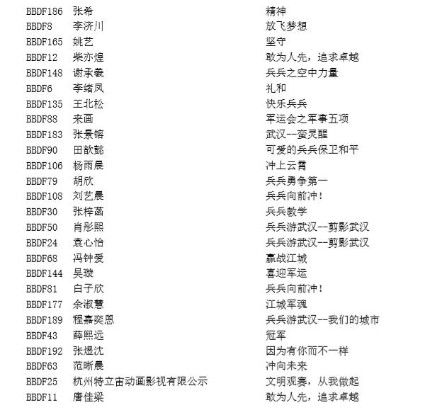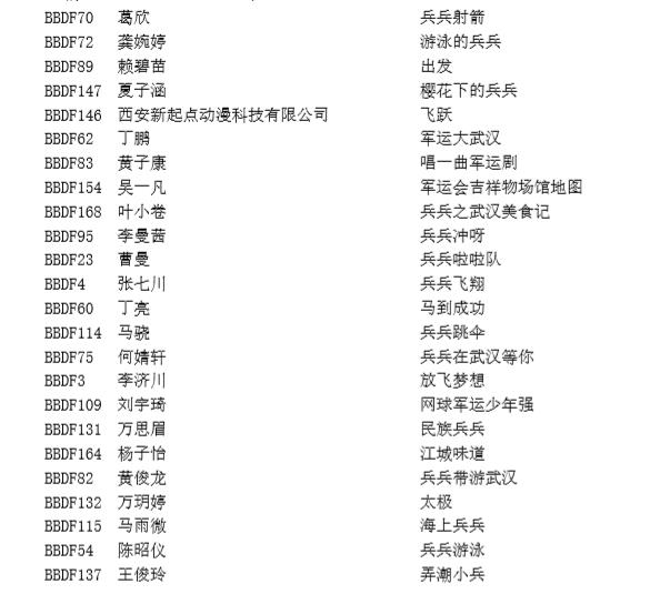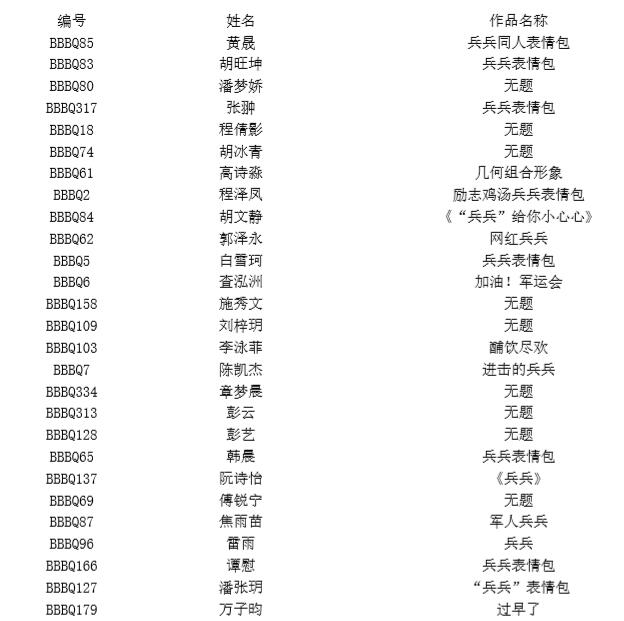 2018年9月28日,第七屆世界軍人運動會“兵兵動漫創作大賽”正式啟動,面向社會征集以軍運會吉祥物“兵兵”為主角的單幅漫畫、多幅漫畫、故事漫畫等動漫作品。根據《兵兵動漫創作大賽作品征集公告》有關規定,經過專家評審、論證、報審等程序,現將獲獎名單及作品予以公告: