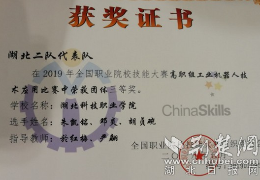 在2019年全國職業院校技能大賽高職組“工業機器人技術應用”賽項中,湖北科技職業學院的朱凱銘、鄧炎、胡貞碗三位同學榮獲團體三等獎。