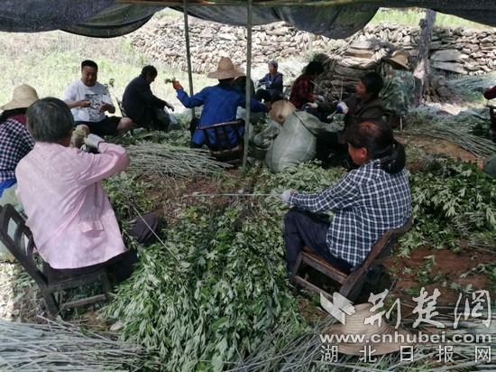 鐵爐村地處武當山南部,屬于亞熱帶季風氣候,雨水充沛,非常適合艾蒿生長。同時,該村地域遼闊,版圖面積27平方公里,野生艾蒿在田間地頭、荒山坡地、路邊河邊隨處可見,產量十分可觀。近年來,隨著艾蒿藥用價值不斷開發和市場需求不斷增長,艾葉價格也持續提高。看著漫山遍野的艾蒿和逐年增長的價格,村兩委干部和駐村工作隊做了調查:一個普通勞動力一天可以收割100公斤濕艾葉,2公斤濕艾葉曬干后為0.5公斤,每公斤干艾葉按4元的價格銷售,一天可掙100元,經濟效益十分可觀。于是,干部們一邊入戶廣泛動員村民收割艾葉,一邊積極聯系商販上門收購。較高的收購價格充分激發了村民的熱情。如今,該村隨處可見村民在田間地頭收割艾葉的身影。