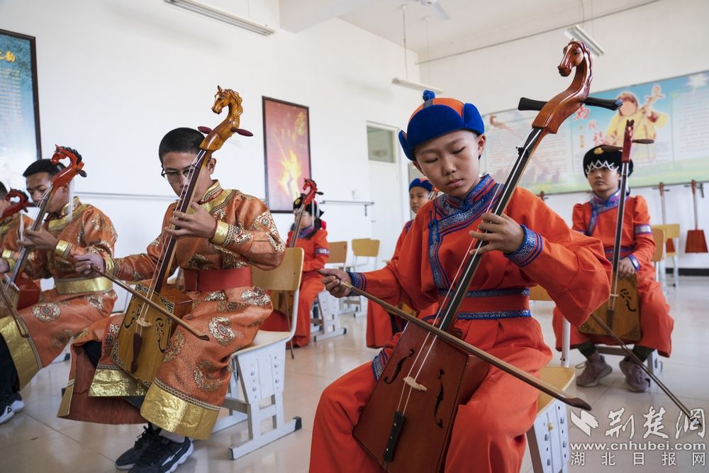 圖為:小學生正在表演蒙古族傳統樂器——馬頭琴。記者 劉建維 攝。