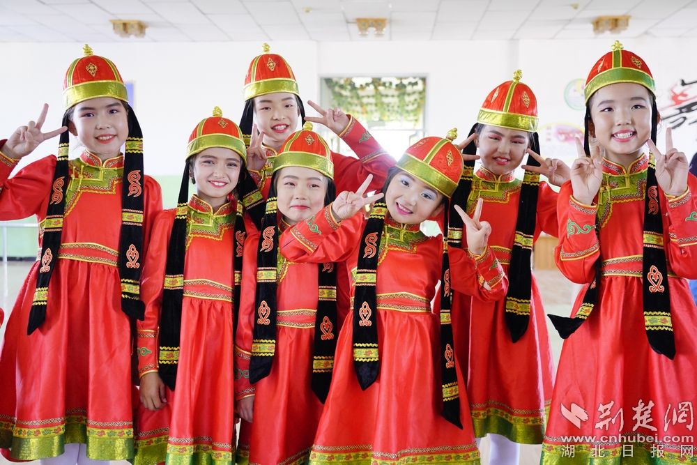圖為:表演“薩吾爾登”的小學生合影。記者 劉建維 攝。