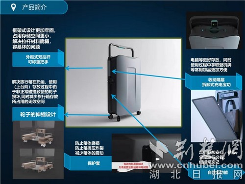 荊楚網(wǎng)客戶端—荊楚網(wǎng)消息(通訊員 張利 謝遠卓)“旅行箱配有可伸縮的輪子、靈巧多變的外式拉桿設(shè)計,同時配備可拆卸式的充電寶以及藍牙找回的GPS定位系統(tǒng),精心的設(shè)計與全面的配套設(shè)施可保證旅游在外或者外出工作時的便利。”近日,在第五屆中國“互聯(lián)網(wǎng)+”大學(xué)生創(chuàng)新創(chuàng)業(yè)大賽中,來自武漢華夏理工學(xué)院機電工程學(xué)院的學(xué)生衛(wèi)鑫杰自豪地介紹著自己小發(fā)明--D&L智能旅行箱。