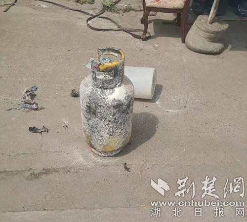這只液化氣罐被劉亞洲抱出來前正噴吐著火苗。(通訊員 衛冬 攝)