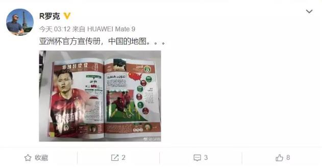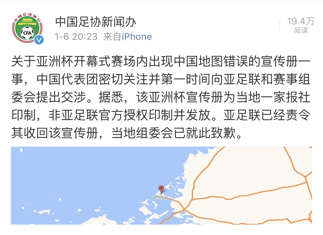 隨后,中國足協新聞辦也在其官微發表聲明,稱關于亞洲杯開幕式賽場內出現中國地圖錯誤的宣傳冊一事,中國代表團密切關注并第一時間向亞足聯和賽事組委會提出交涉。據悉,該亞洲杯宣傳冊為當地一家報社印制,非亞足聯官方授權印制并發放。亞足聯已經責令其收回該宣傳冊,當地組委會已就此致歉。