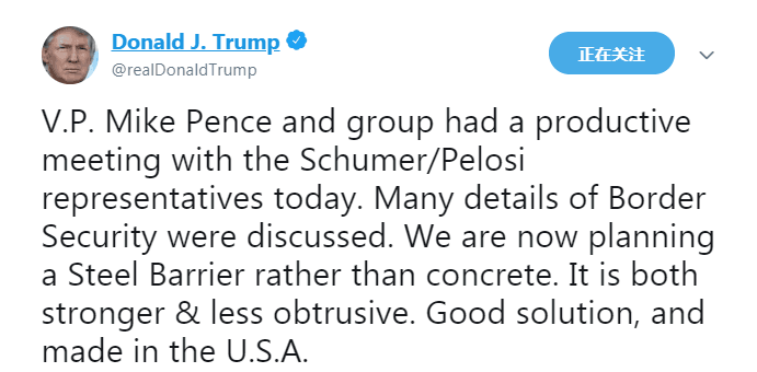 他在推特上寫道:“副總統(tǒng)邁克·彭斯今天與民主黨領(lǐng)袖舒默和佩洛西的代表進行了富有成效的會議,討論了邊境安全的諸多細節(jié)。我們現(xiàn)在正計劃建造一道鋼制屏障,而不是混凝土造的。這更結(jié)實又不那么突兀。很好的解決方案,還是美國制造。”