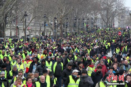資料圖:當(dāng)?shù)貢r(shí)間1月5日,法國(guó)2019年首輪示威,巴黎數(shù)以千計(jì)民眾再次走上街頭,在市中心游行抗議。中新社記者 李洋 攝