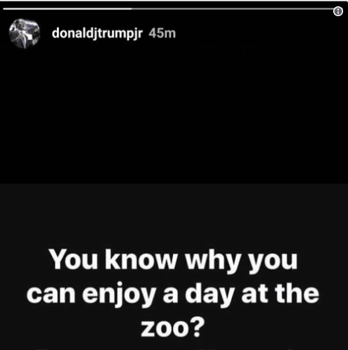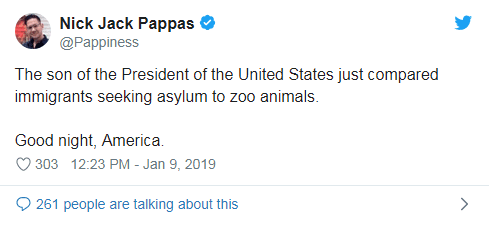 “美利堅合眾國總統的兒子剛剛把尋求庇護的移民比作動物園的動物。晚安,美國?!?/p>