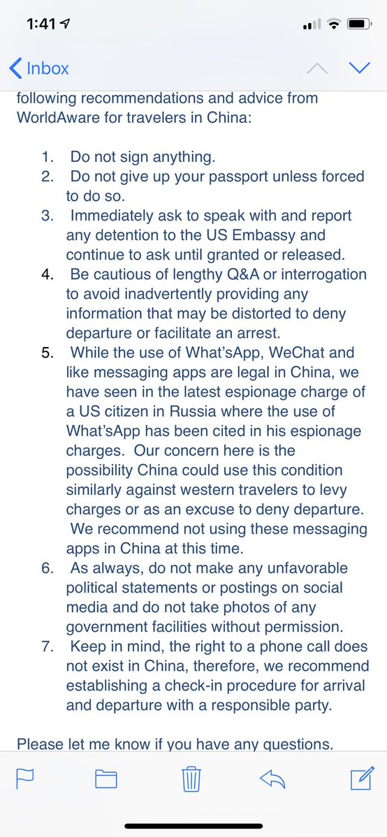 “雖然在中國用whatsapp或者微信是合法的,我們擔心的是,由于此前俄羅斯在審訊美國間諜時曾經指責他使用WhatsApp,中國可能效仿俄羅斯一樣對西方旅客進行處罰,或者以此為借口拒絕西方旅客出境。我們建議現在不要使用這些應用。”看起來戴維斯也比較心虛,這些信息并非官方公告,而是私下里由“校長信箱”直接發給理工科學生的。不僅如此,該校還“甩鍋”稱,這些警告是來自于一個私人的情報公司,并非校方立場。