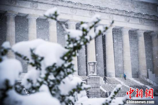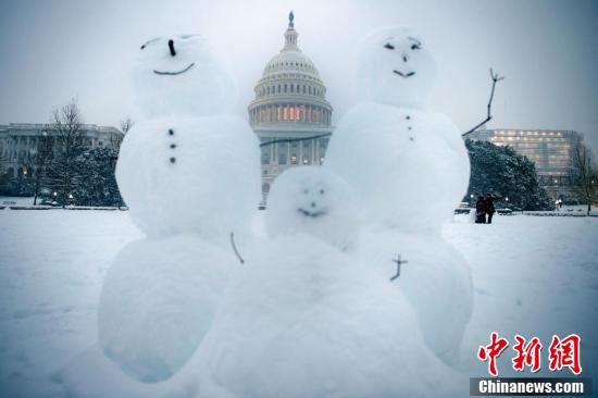 1月14日消息,綜合報道,近日一場大規模的冬季暴風雪覆蓋了美國中西部各州,造成堪薩斯州、內布拉斯加州和密蘇里州等多地大面積停電、道路封閉。圖為美國國會大廈前堆砌的雪人。
