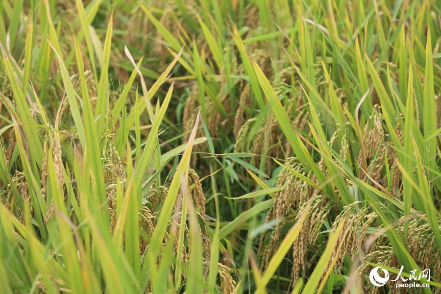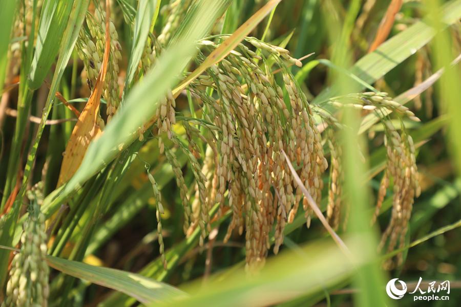 豐收中的雜交水稻示范田航拍。(呂強攝)