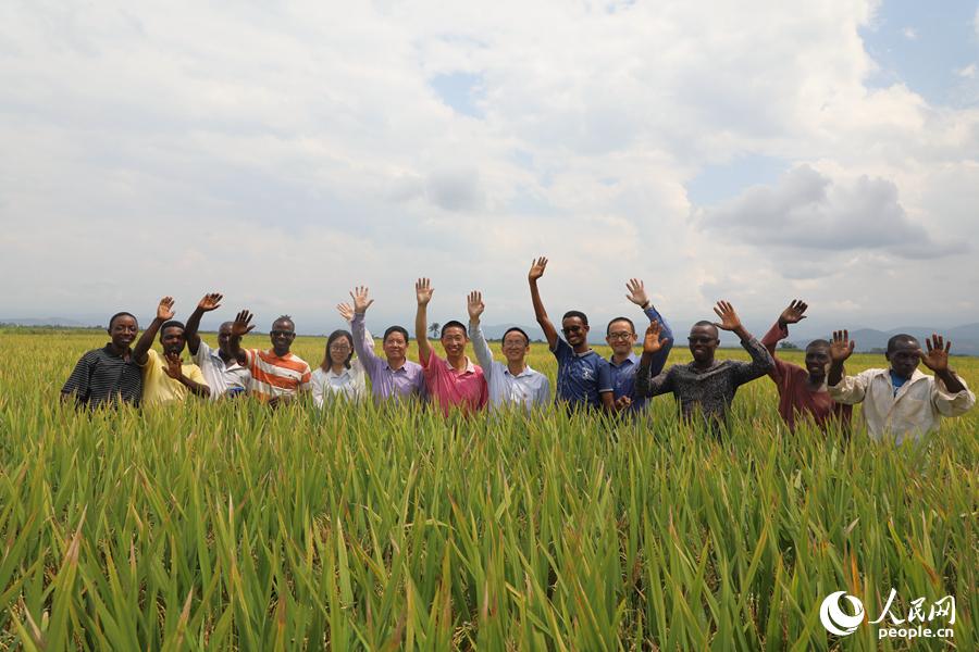 中國專家組和當地技術員在豐收的稻田里合影。(呂強攝)