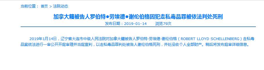 2019年1月14日,遼寧省大連市中級人民法院對加拿大籍被告人羅伯特·勞埃德·謝倫伯格(ROBERT LLOYD SCHELLENBERG)走私毒品案依法進行一審公開開庭審理并當庭宣判,以走私毒品罪判處被告人謝倫伯格死刑,并處沒收個人全部財產。稍后將發布庭審詳細信息。