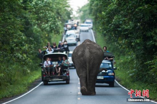 資料圖:一頭大象突然闖入泰國公路中央,開始漫步。 圖片來源:視覺中國