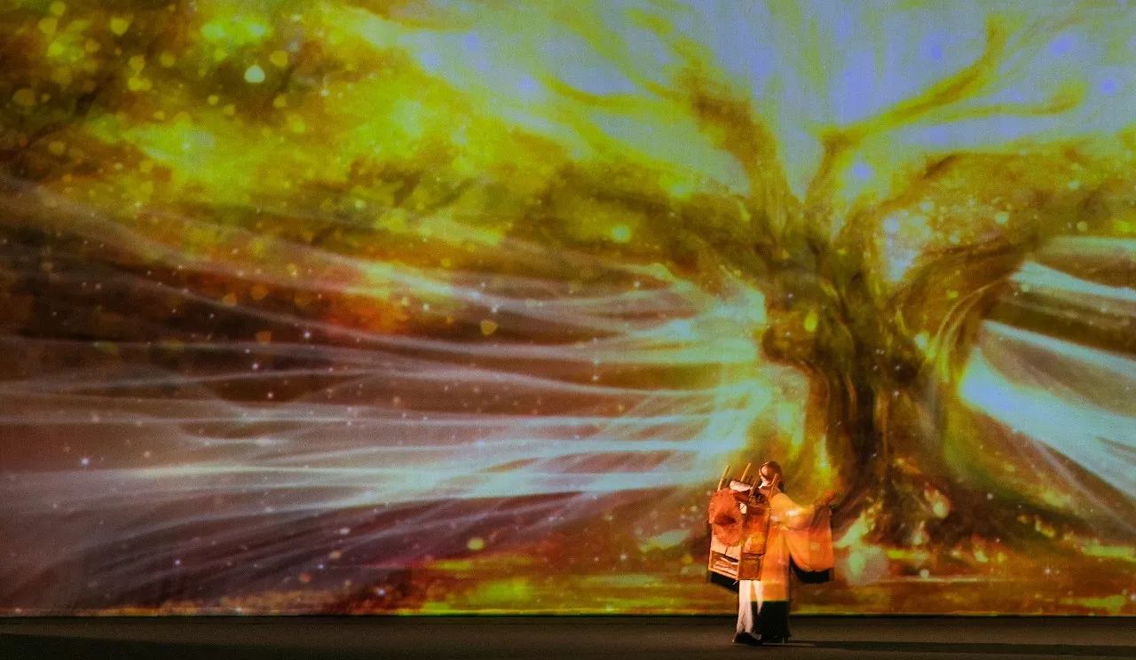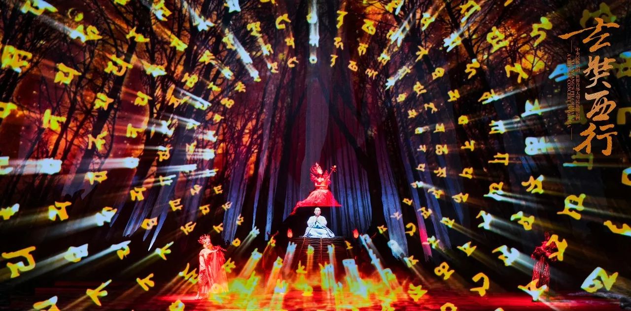 這一次,他們選擇不拘泥常規民族器樂表現形式,將舞臺表演和樂器演奏突破性的融合在一起,從“大乘天”起,“佛門”“一念”“潛關”“問路”“遇險”“極樂”“高昌”“普度”“雪山”“祭天”“菩提”“那爛陀”“如夢”到“大唐”,整整15個章節貫穿著演奏家“音樂”和“語言”的雙重表述,演奏、吟誦、對白、形體動作與劇情結合,大大拓展樂器演奏的表演形式,將器樂、文化與劇情有機結合,運用多媒體視角和舞美技術建構虛實空間,以故事性敘事方法講述玄奘西行,令人耳目一新。