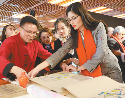 2月1日,在木版年畫傳承人的指導(dǎo)下,墨西哥觀眾體驗(yàn)?zāi)景婺戤嫷闹谱鬟^程?! ”緢笥浾?劉旭霞攝