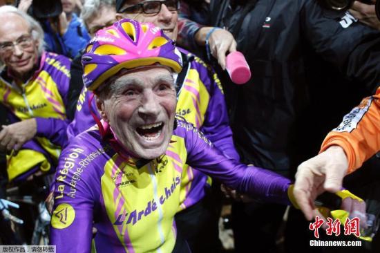 資料圖:105歲法國老人參加室內(nèi)自行車賽。