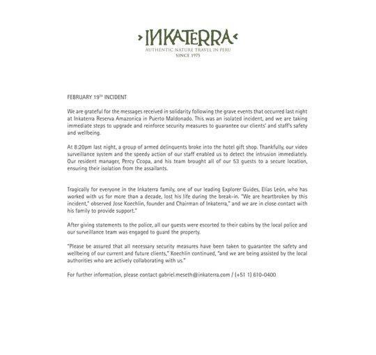 聲明對事件進一步闡釋,19日晚8點20分,一群武裝分子沖入酒店禮品店,商店的監控攝像頭和員工的迅速反應使得很快就將闖入者辨認出來。住戶經理Percy Ccopa帶領其團隊將53名客人撤離到安全地點,確保他們于襲擊者隔離開來。