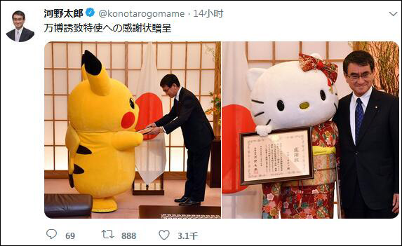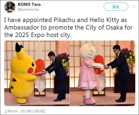 2017年11月28日,河野太郎在推特上公布,日本這次申辦2025年世博會的形象大使將由皮卡丘和Hello Kitty兩名角色擔任。