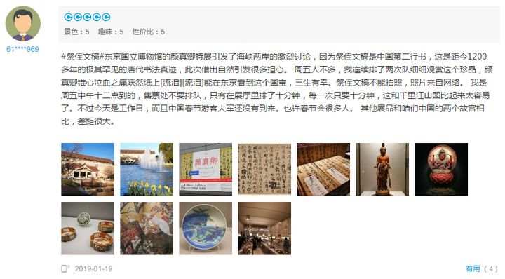 一位攜程的用戶特別選擇春節(jié)游客前的一個(gè)周五中午人少的時(shí)候來參觀,連續(xù)排了兩次對(duì)細(xì)細(xì)觀賞這個(gè)“天下第二行書”珍品。在現(xiàn)場(chǎng)他感受“顏真卿錐心泣血之痛躍然紙上”,為此留下了眼淚,評(píng)價(jià)說“能看到這個(gè)國(guó)寶,三生有幸”。