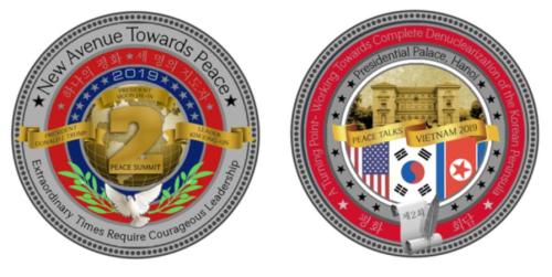白宮紀(jì)念品店推出的第二次“特金會(huì)”紀(jì)念幣,正面印有“2”,和兩國領(lǐng)導(dǎo)人的名字,以及“邁向和平的新路”(New Avenue Towards Peace)。背面則有美國、朝鮮、越南3國國旗,與“2019越南和平對(duì)話”(PEACE TALKS VIETNAM 2019)、“第2次”等字。