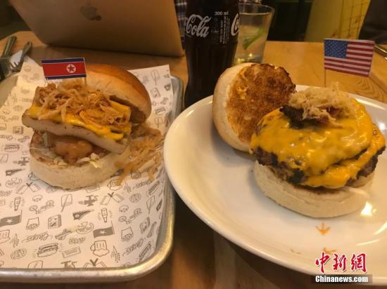 當(dāng)?shù)貢r(shí)間2月25日,越南河內(nèi)一家餐廳特地推出兩款以金正恩、特朗普為主題的漢堡招徠顧客。中新網(wǎng)記者 孟湘君 攝