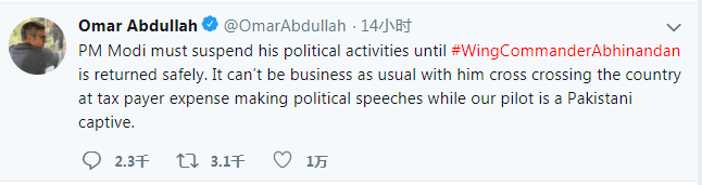 阿卜杜拉在推特上寫道:“當我們的飛行員被巴基斯坦俘虜時,(莫迪)不能花著納稅人的錢像往常一樣在全國各地進行政治演講。”
