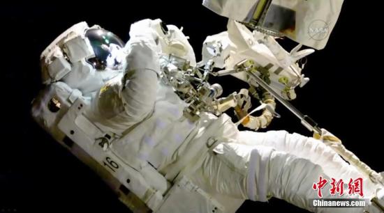 資料圖:國際空間站的宇航員進行太空行走,更換機器手臂。
