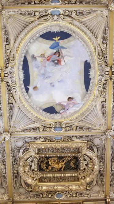 △節日大廳屋頂中部是壁畫《共和國保衛和平》,由法國著名畫家紀堯姆·迪比夫(Guillaume Dubufe)于1896年所作。(央視記者洪磊拍攝)