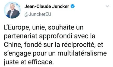 △歐盟委員會主席容克也發文稱,“歐盟達成統一戰線,希望同中國建立更加親密的合作伙伴關系。這種意愿是相互的。歐盟也決心投身到更公平和更高效的多邊主義中去。”(央視記者康玉斌提供)