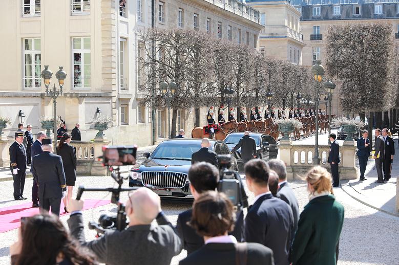 在習主席結束當天密集的國事訪問活動后,法國總統馬克龍在愛麗舍宮為他舉行了歡送儀式。