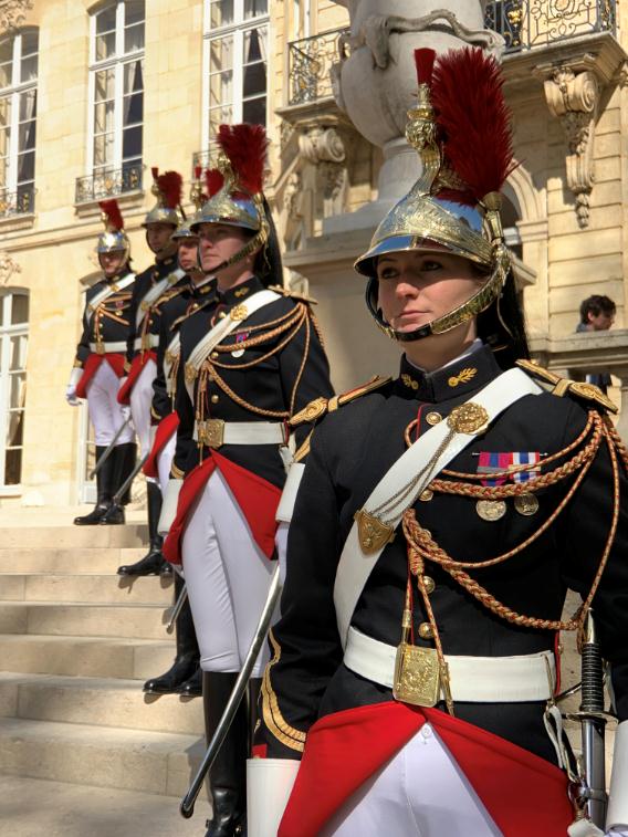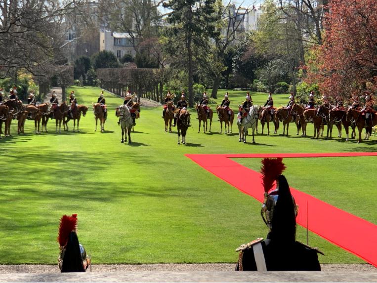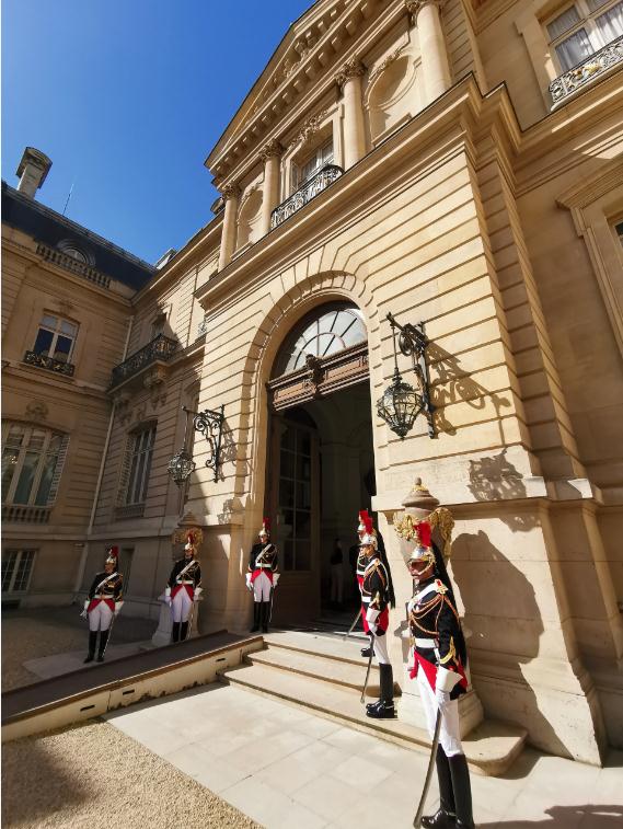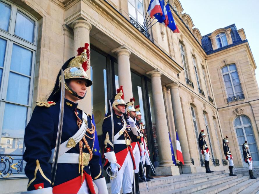 △愛麗舍宮前送行的禮兵。(央視記者荊偉拍攝)