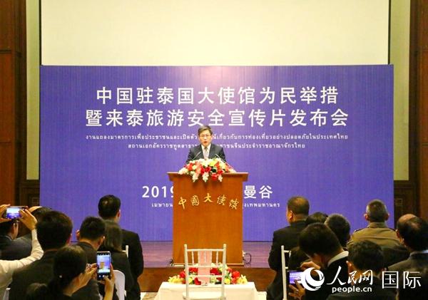 人民網曼谷4月18日電(郭雨祺、鄭美辰)4月18日,中國駐泰國大使館舉行為民舉措暨來泰旅游安全宣傳片發布會。中國駐泰國大使呂健在發布會上強調,同胞走出國門,最關心的是安全和便利,“維護海外中國公民安全與合法權益是最接地氣、最與人民群眾切身利益相關的外交工作,是習近平主席‘外交為民’思想的重要內容和具體體現。在習近平外交思想指引下,駐泰國使館堅持以人民為中心,積極參與建設海外中國平安體系,把在泰中國公民安危冷暖時刻放在心上,不斷改進領事保護與服務工作。”