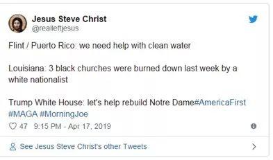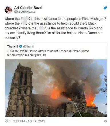 就如下面這位美國網民所說:弗林特和波多黎各都需要清潔的水源,路易斯安納的黑人教堂剛剛被燒毀,可白宮卻只說:讓我們去修復圣母院吧……