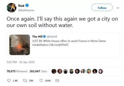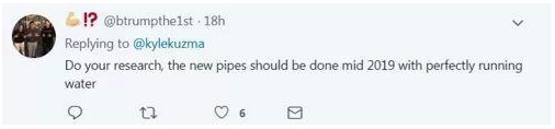 其中帶頭反對政府這么做的一位美國網絡大V名叫凱爾·庫茲馬(Kyle Kuzma),是美國NBA洛杉磯湖人隊的知名球員。他發帖斥責說:“再說一遍。我再說一遍:我們有一座城市還在缺水”。