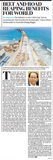 人民網堪培拉4月24日電 據外交部網站消息,中國駐澳大利亞大使成競業于24日在澳大利亞主流媒體《澳大利亞金融評論報》發表署名文章《“一帶一路”造福世界》。成競業在文中表示,第二屆“一帶一路”國際合作高峰論壇即將舉行,堅信高峰論壇一定會推動“一帶一路”國際合作邁向更高質量發展,為世界經濟增添動力,為各國人民增進福祉。