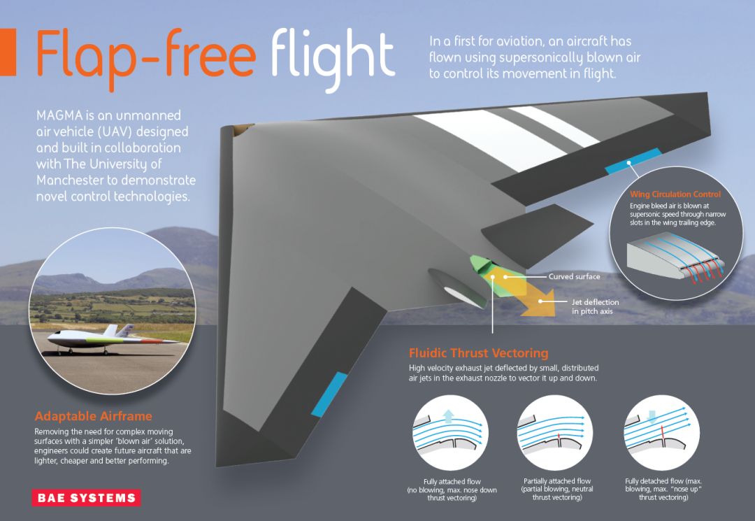 這款名為Magma的無人機在威爾士北部的蘭貝德機場實施了數次測試飛行。BAE宣稱,該機演示的2種新穎飛行控制技術有望“徹底改變航空器的設計理念”。