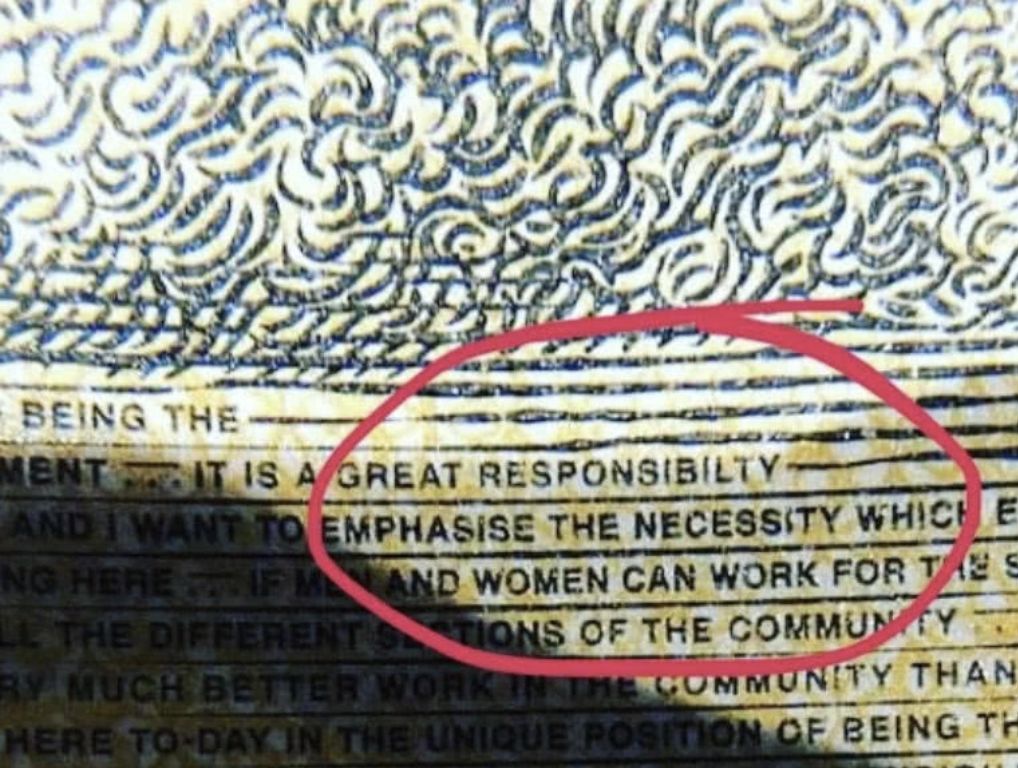 這個單詞拼寫錯誤用肉眼很難發現,印在了澳大利亞議會首位女議員伊迪絲·考恩旁邊的防偽縮微文字上。這段文字來自于她在西澳大利亞州議會發表的第一次演講文本。