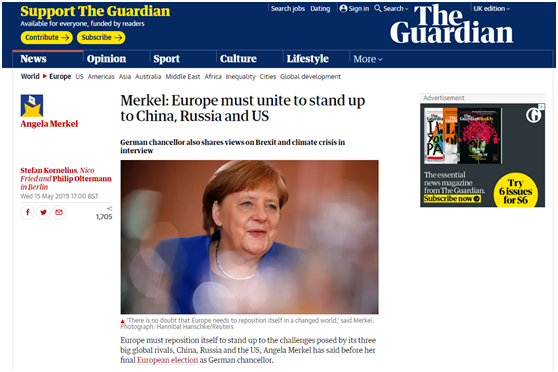 【環球網報道 記者 劉洋】 “歐洲必須團結起來應對3個全球對手帶來的挑戰:美國、中國和俄羅斯”,英國《衛報》15日說,這是德國總理默克爾在其最后一次以德國總理身份參與歐洲議會選舉時,對歐洲發出的呼吁。