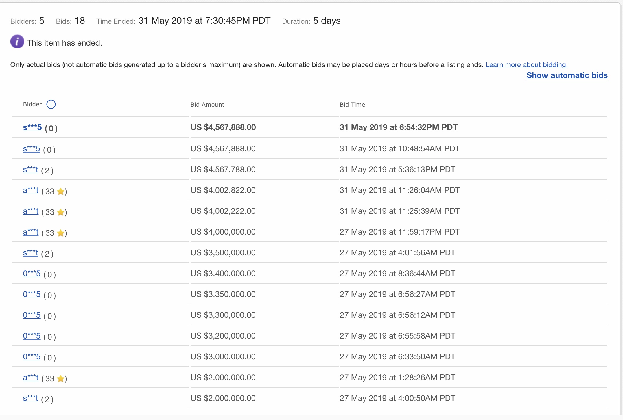 eBay網站顯示,在5天的拍賣過程中,共有5名參與者進行了18次叫價。目前,勝出者的身份尚未揭曉。其eBay網站用戶名為“s***5”,在這次拍賣過程中,這位用戶在最后一天才參與競價,只叫價了2次,就成為了最終勝出者。