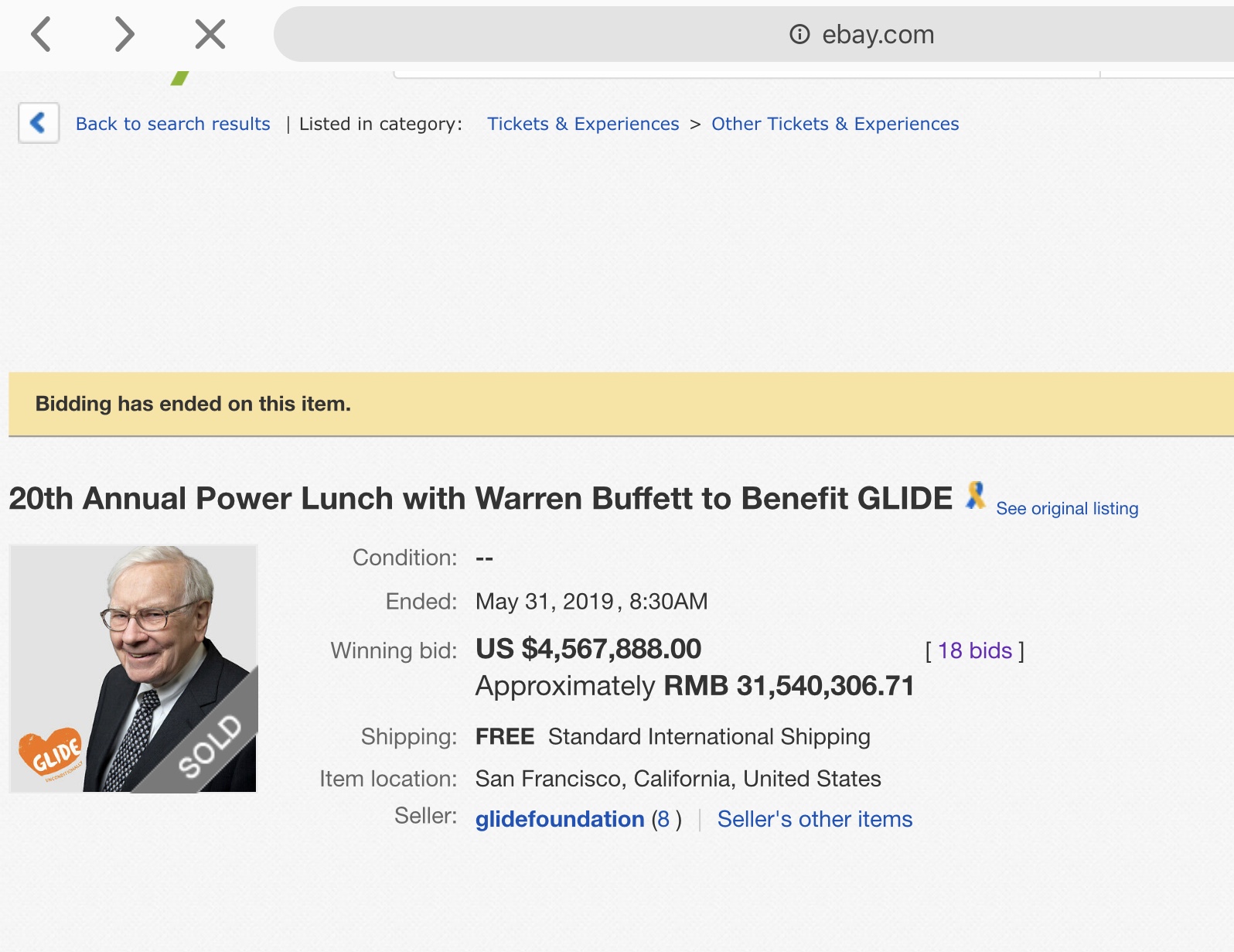 本次拍賣的起拍價為2.5萬美元,這也是近年來巴菲特慈善午餐拍賣的例行起拍價。而2019年的競拍過程明顯要比過去激烈,開拍不足2天,拍賣競價就已經達到350.01萬美元,不僅超越了2018年時330.01萬美元的價格,而且刷新了2012年和2016年時創下的歷史最高價紀錄345.678萬美元。